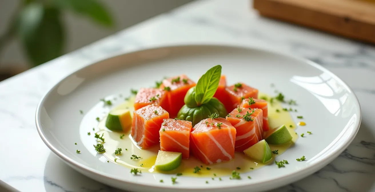 La verità, dal punto di vista di chi lavora il pesce crudo con venerazione, è che una tartare di salmone eccezionale non ha bisogno di maschere. Il segreto non sta nell’aggiungere, ma nel bilanciare. E se la vera chiave non fosse l’intensità dell’acidità, ma la sua perfetta integrazione con la parte grassa del pesce? E se la texture, la sensazione del cubetto di salmone che si scioglie in bocca, fosse persino più importante del condimento stesso? Questo è l’approccio purista: ogni gesto, dal taglio alla mantecatura, deve servire un unico scopo: esaltare la purezza e la delicatezza intrinseca del salmone.